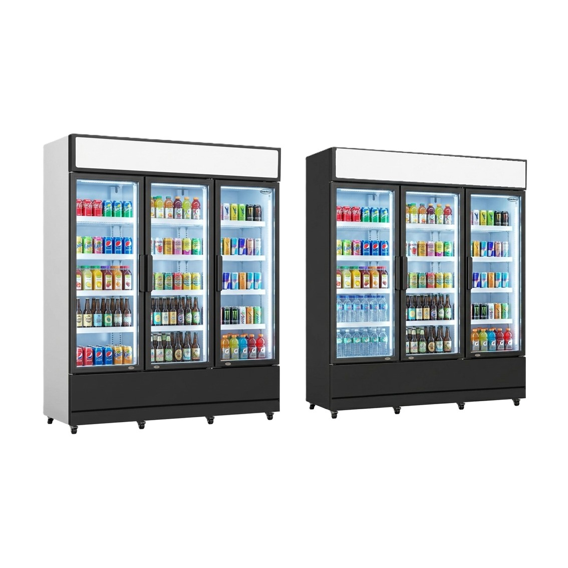 3 neue, sparsame Kühlregale mit Metalletagen.